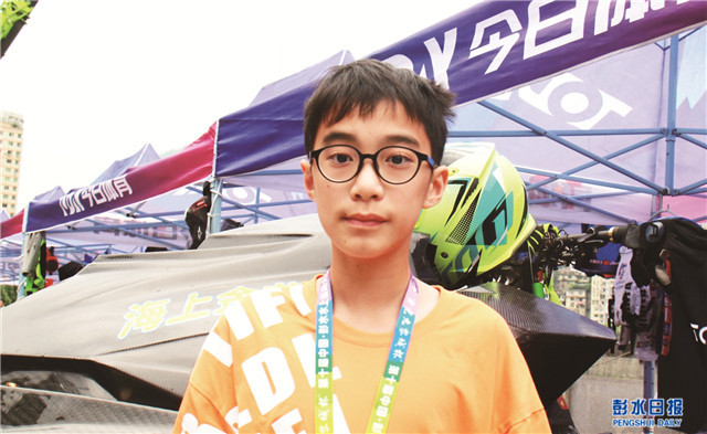 馬達(dá)轟鳴、浪花飛濺,水上摩托艇激起的數(shù)米浪花引來陣陣歡呼,僅13歲的楊宸卻是淡定自若。