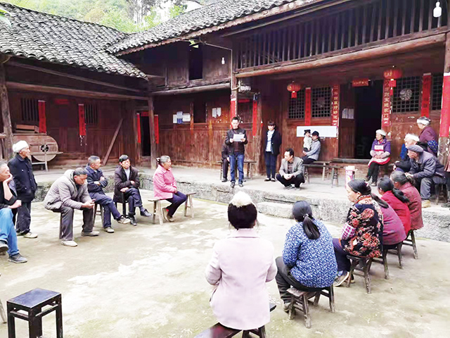 潤(rùn)溪鄉(xiāng)巖角村組織黨員干部和部分村民以院壩學(xué)習(xí)會(huì)的方式學(xué)習(xí)領(lǐng)悟黨的十九屆六中全會(huì)精神。 通訊員 晏永強(qiáng) 攝影