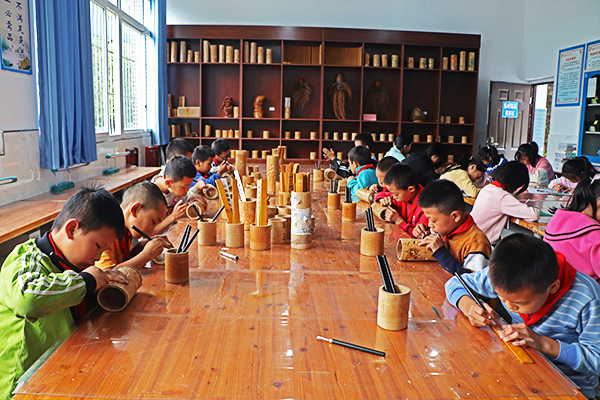 萬足中心校校長張芬介紹:“在抓實文化課程的基礎之上,學校設立了竹刻、剪紙、刺繡、籃球、足球等10多個特色課程,豐富學生的課余生活,培養(yǎng)他們的興趣愛好?!?/p>