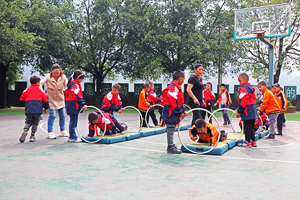 初冬時節(jié),在萬足中心校操場,學生們正在進行課間體育活動,有的在轉呼啦圈,有的在打籃球,有的在跳繩,有的在踢足球……在綠樹掩映下充滿了生機和活力。