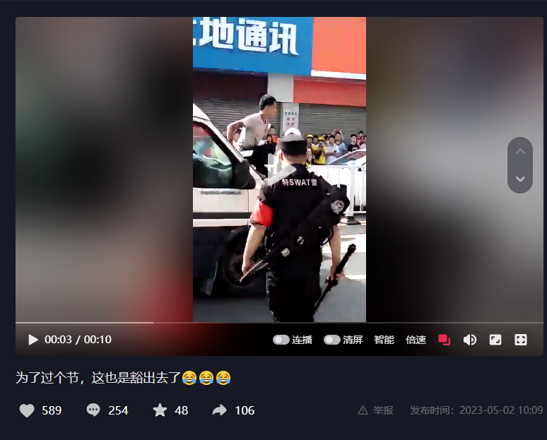 5月2日,“重慶網(wǎng)警”在工作中發(fā)現(xiàn),有網(wǎng)民在某短視頻平臺(tái)連續(xù)發(fā)布了兩則疑似一持刀男子與警察對(duì)峙及特警抓捕嫌疑人的短視頻,并配以文字: