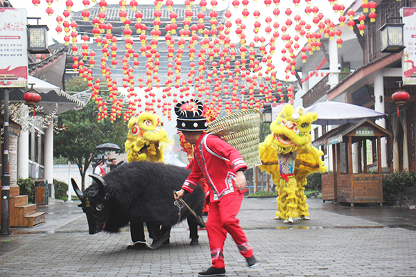 活動(dòng)現(xiàn)場(chǎng),一時(shí)鑼鼓喧天,只見一名表演者牽牛、兩名表演者玩牛,兩個(gè)人將栩栩如生的黑牛道具披在身上,在牽牛人的逗弄下,時(shí)而發(fā)怒、時(shí)而撒歡、時(shí)而老實(shí);舞動(dòng)的“雄獅”雙眼靈動(dòng),外形俊俏,大嘴張合有度,時(shí)而搖頭擺尾、昂首仰視,時(shí)而俯身匍匐,舞姿妙趣橫生;游動(dòng)的“巨龍”也毫不遜色,蛟龍漫游、蛻皮、鉆節(jié)、追珠,一個(gè)個(gè)經(jīng)典動(dòng)作被舞龍者展現(xiàn)得淋漓盡致。期間,吹嗩吶、玩牛、烏江號(hào)子等傳統(tǒng)藝術(shù)表演博得現(xiàn)場(chǎng)觀眾拍手叫絕。