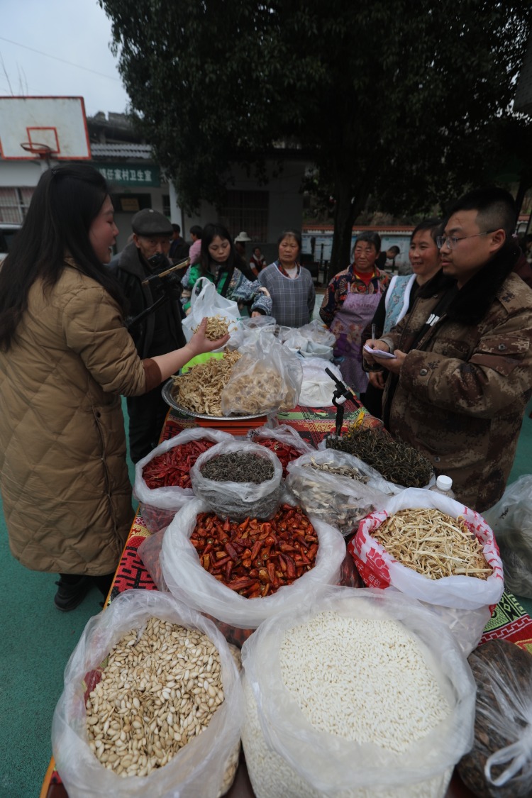 喧鬧的現(xiàn)場(chǎng),一位年過(guò)七旬的婆婆擠進(jìn)了人群,“我這有胡豆、南瓜干、紅苕粉些,你們幫我賣(mài)了嘛。”